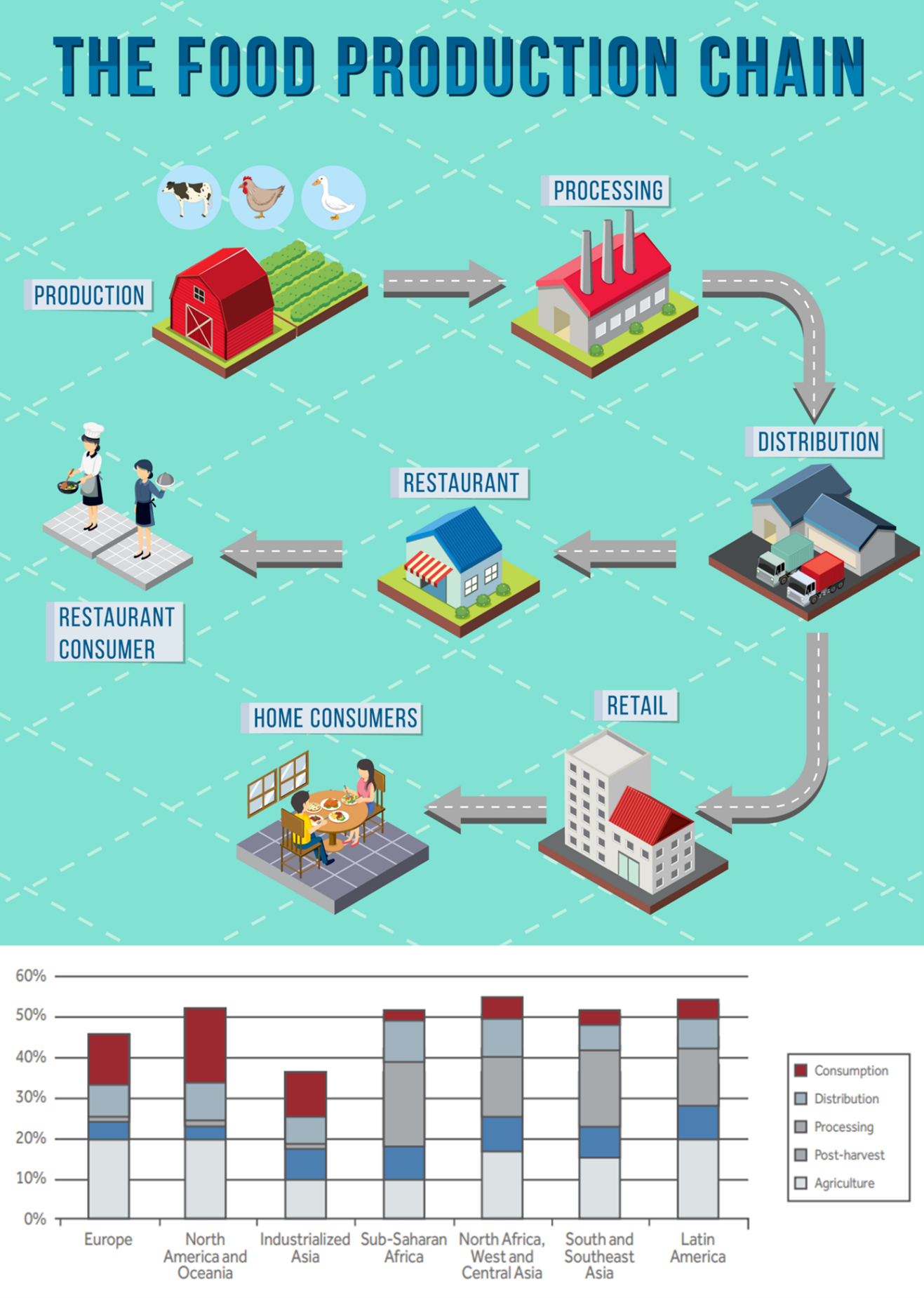 Fig.1: Food waste represents a loss of valuable resources used in agriculture and additional wastage occurs throughout the supply chain.