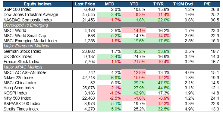 Closer to home (APAC), North Asia and ASEAN saw varied but generally positive returns. Japan (+6.8% MTD) outperformed the region counterparts although Australia, China, and Singapore are staying close behind at +5% MTD performance. Japan also benefited from trade deal tailwinds and global demand recovery while China equities rallied on signs of policy support (monetary and fiscal), infrastructure spending, and AI breakthrough. Singapore equities momentum remained strong supported by government support and rate-cut optimism. PE of 13x is still attractive compared to other developed markets and provide runway for the rally to continue.