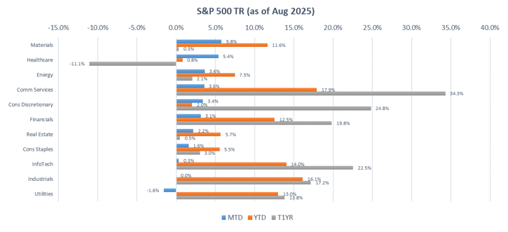The equity market momentum continued in August, with the S&P 500 delivering +2.0% MoM return, underpinned by growing expectations of monetary easing and strong gains in AI and tech-led earnings. Value displayed relative outperformance as the Dow Jones Industrial Average led with +3.4% MoM. The NASDAQ Composite with its heavy growth/tech weighting, still posted a solid +1.7% MoM but lagged the broader indices.