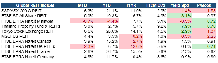 Global REITs delivered mostly positive performance in August, with top performers being Japan (+6.6% MTD), Australia (+6.3% MTD), and Singapore (+5% MTD). The performance was driven by the anticipated rate-cut from the Fed, supporting overall market rallies and providing a stable environment for income-generating assets like REITs. Both globally and in Singapore, REITs benefited from resilient balance sheets, attractive dividend yields, and broad-based sector strength, including recovery in hospitality, and continued demand in industrial and data centers.