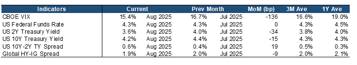 Market volatility eased further in August, with the CBOE VIX falling to 15.4% (-136 bps MoM), below both its 3M average (16.6%) and 1Y average (19.0%), underscoring continued investor optimism amid resilient earnings and AI-driven optimism. Credit conditions also improved as the Global HY-IG spread narrowed to 1.9% (-9 bps MoM), signaling sustained risk appetite despite lingering growth uncertainties.
