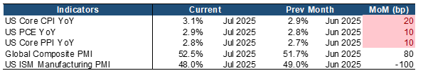 Overall, August data highlight a mixed backdrop: sticky inflation is likely to keep the Fed in a data-dependent stance, while global growth momentum is showing early signs of stabilization. With services strength offsetting US manufacturing weakness, risk assets remain supported, though tariff-related cost pressures and the pace of disinflation will be critical swing factors for the policy outlook into year-end.