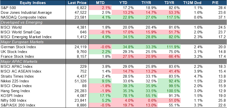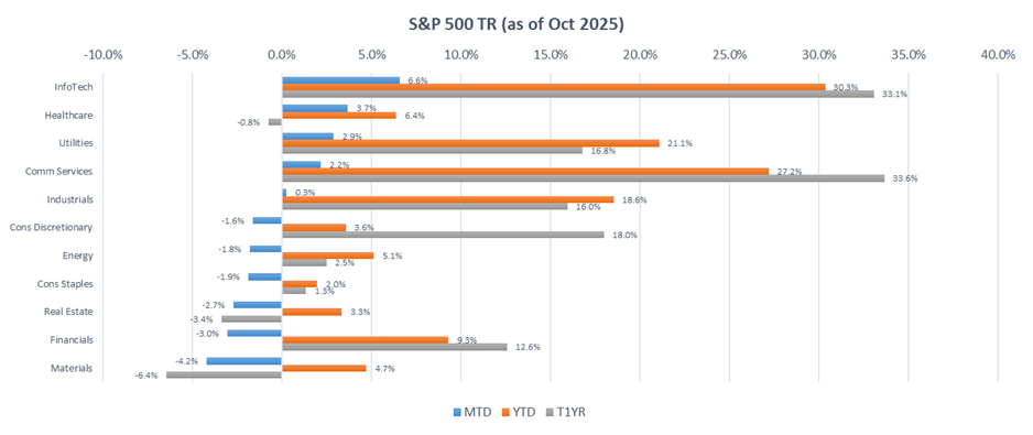 Within the S&P 500, InfoTech (+6.6% MoM) remains the best performer driven by AI-linked growth and cloud infrastructure plays, supported by strong earnings momentum despite the increased in enterprise capex spending. Health Care (+3.7% MoM) advanced on improving regulatory clarity and renewed investor appetite for innovation, particularly in biotech and AI-driven drug development. Meanwhile, Utilities (+2.9% MoM) benefited from defensive positioning and structural demand tied to power-grid demand and AI-led Data Centre expansion.