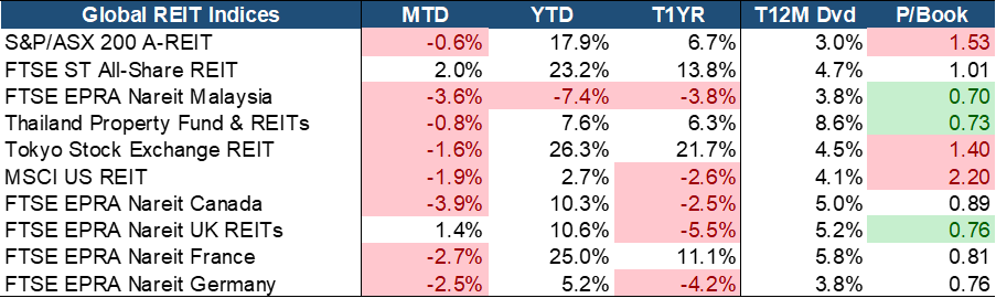 Global REITs reported a mostly negative performance in October, with Singapore (+2% MoM) and UK (+1.3% MoM) delivering the only positive returns MoM. Higher-for-longer rates have pressured REIT valuations and reignited funding costs concern.