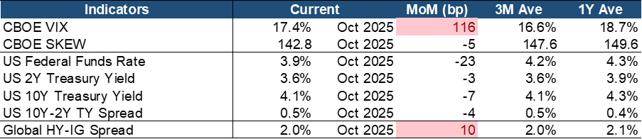 Market volatility has reignited in October, with the VIX rising by 116 bps MoM, crossing its T3M average (~17%) but still sits under T1Y average (~19%). The SKEW has fallen to 143 but still hovering near 150 level. Concern for an AI bubble or an unexpected tail risk event has grown, but ongoing strength in corporate earnings and elevated excitement around AI-driven productivity still had investors feared for missing out.