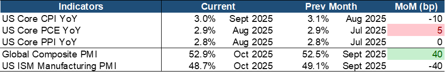 Key macro indicators continue to suggest that inflation remains sticky, though not runaway, while growth signals are mixed but showing glimmers of stabilization globally. The U.S. government shutdown has caused missing September inflation data and the data-dependent Fed will likely to take a more cautious decision as a result. But the Fed’s preferred gauge, Core PCE, stayed at 2.9% YoY in August, still anchored above central bank 2% comfort zones. The leading Core PPI stayed at 2.8% YoY as well, hinting at underlying cost pressures upstream that could still feed into consumer inflation over time.