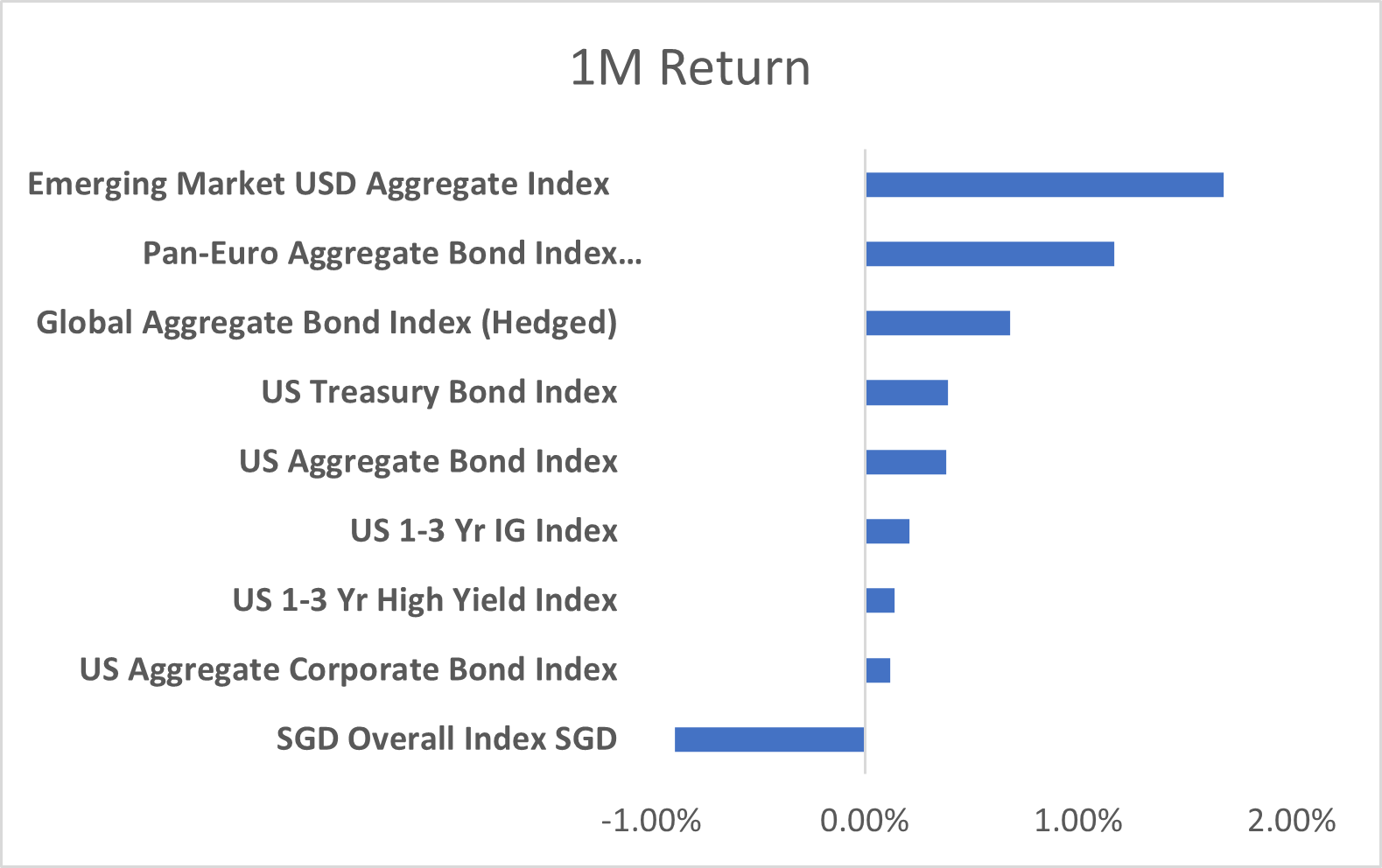 Bond market returns were broadly positive in October, with most major indices delivering modest gains. The notable exception was the SGD Overall Index, which posted a second consecutive monthly decline in USD terms its underperformance driven primarily by FX translation effects, as the Singapore dollar weakened against the US dollar from mid-September through October. The marked a reversal from earlier in the year, when SGD strength had consistently amplified USD-based returns. In contrast, the Emerging Market USD Aggregate Index and the Pan-Euro Aggregate Bond Index outperformed, supported by stable credit spreads and a modest rally in long-end rates. Eurozone yields declined as fiscal concerns eased and inflation pressures moderated, while EM debt benefited from renewed carry demand amid a more stable risk backdrop.
