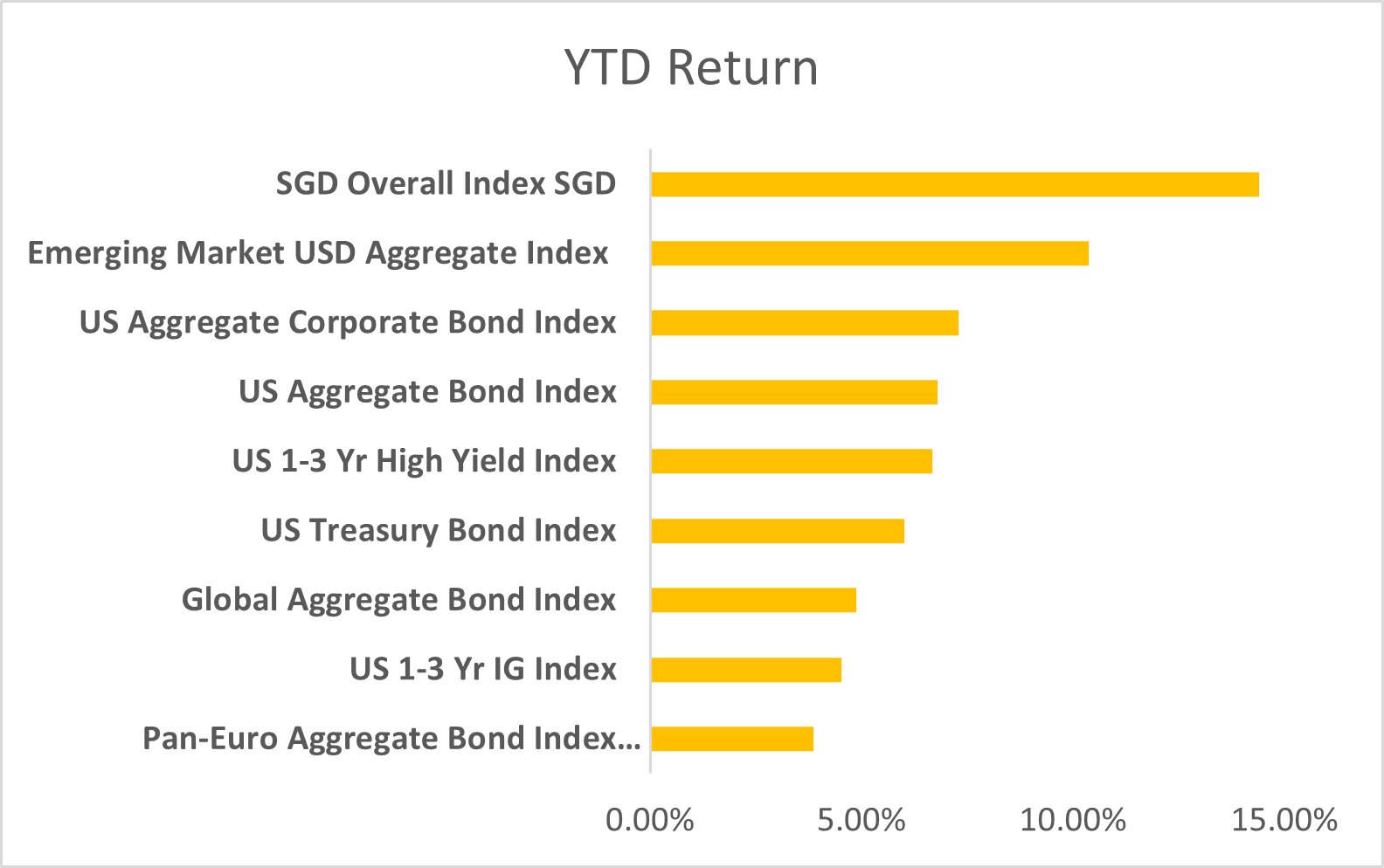 Year-to-date, the SGD Overall Index remains the top performer, with gains approaching 15%, supported by resilient domestic credit fundamentals and a favourable rate environment. Falling interest rates have directly boosted bond valuations. Emerging Market USD debt and US corporate bonds have also delivered strong YTD returns, while the Pan-Euro Aggregate Index continues to lag amid persistent rate volatility and lingering macroeconomic uncertainty across the eurozone.