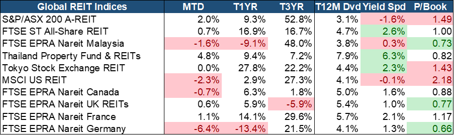 Global REITs reported a mostly positive performance in December, with Thailand (+4.8% MoM) and Australia (+2% MoM) performing the best. S-REITs (0.7% MoM) have relatively lagged, but continue to benefit from resilient fundamentals, attractive dividend yields, and broad-based sector strength, including recovery in hospitality, and continued industrial and retail. Valuations and yields remain attractive with a compelling 2.6% trailing yield spread, the second highest globally, and trading at a fair 1x PB considering the quality of the assets.