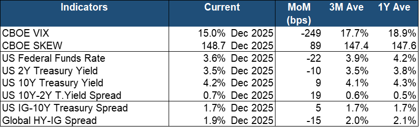 Equities delivered mixed monthly performance in December. The S&P 500 was flat MoM while value stocks as loosely represented by the DJIA (+0.9% MoM) fared better than the tech-heavy NASDAQ Composite (-0.5% MoM). Overall, equities wrapped up 2025 with double-digit returns across the board, riding on the back on AI-led growth and the expectations for a continued interest rate downcycle.