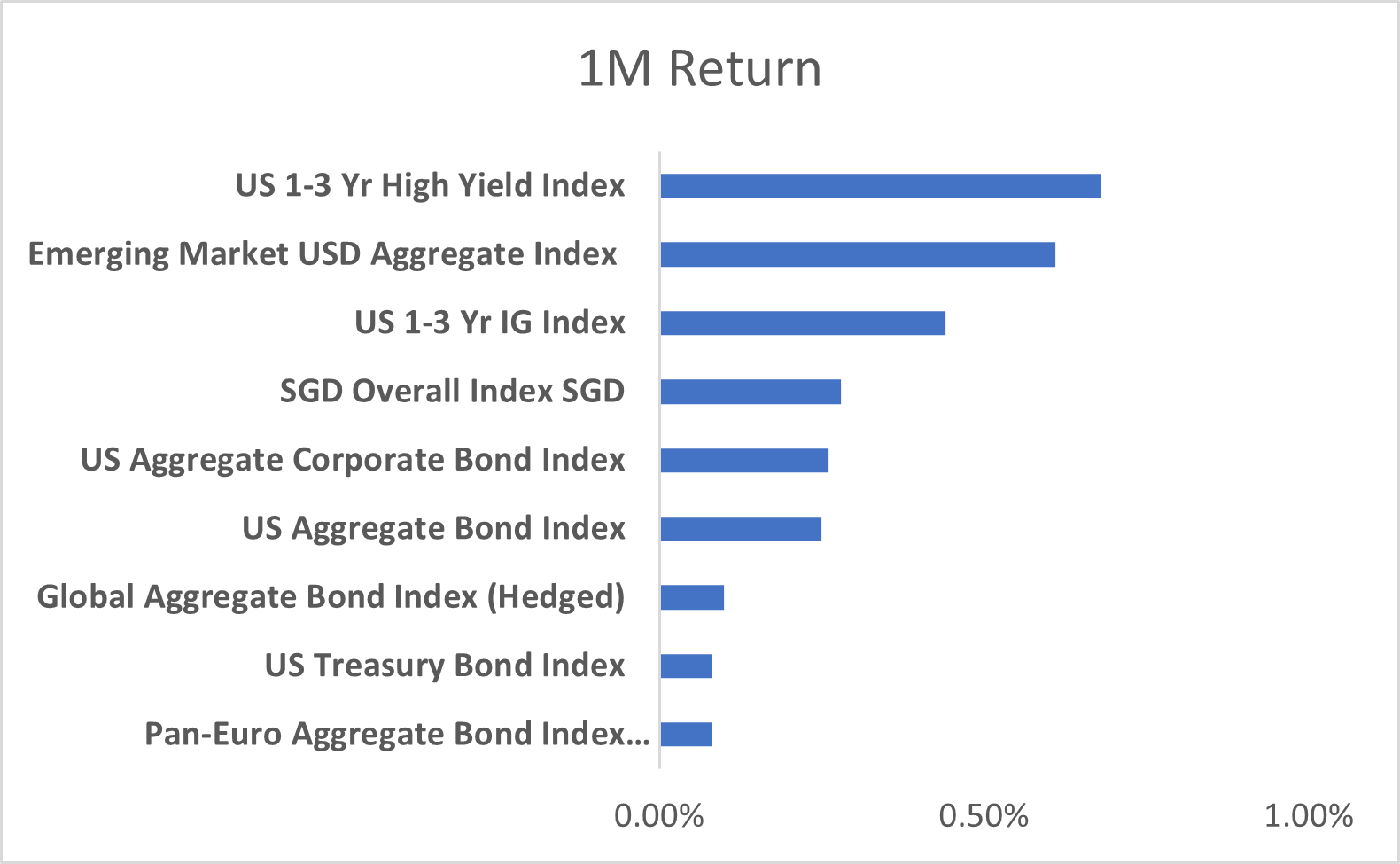 Bond markets closed the year on a positive note, with December marking another month of broad-based gains across major indices. Short-duration high yield and emerging market debt led the charge, buoyed by resilient risk sentiment and supportive macro dynamics. The US 1–3 Yr High Yield Index posted the strongest one-month return, followed closely by the EM USD Aggregate Index and US 1–3 Yr IG Index, underscoring continued investor appetite for carry and credit exposure.