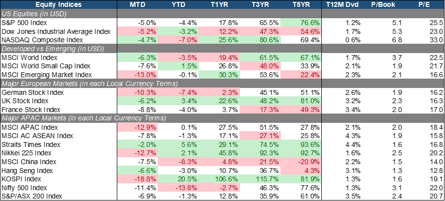 Closer to home, APAC equities declined sharply (-12.9% MoM) as the region remains highly sensitive to global trade dynamics and energy price shocks. Singapore (+2% MoM) stood out as the most resilient market, supported by its relatively benign inflation profile, stable macro outlook, and strong banking sector fundamentals, which benefit from a higher interest rate environment. China and Hong Kong (-7.5% / -6.6% MoM) also fared relatively better, underpinned by improving earnings momentum in selected sectors and ongoing policy support that helped cushion external headwinds. In contrast, South Korea (-18.8% MoM) and Japan (-12.7% MoM) were the worst-performing markets in the region, given their heavy exposure to cyclical exports, particularly semiconductors and technology hardware, which are more sensitive to global demand slowdowns and rising discount rates. Japan additionally faced pressure from higher import costs and a gradual shift in monetary policy expectations amid rising inflation linked to energy prices.