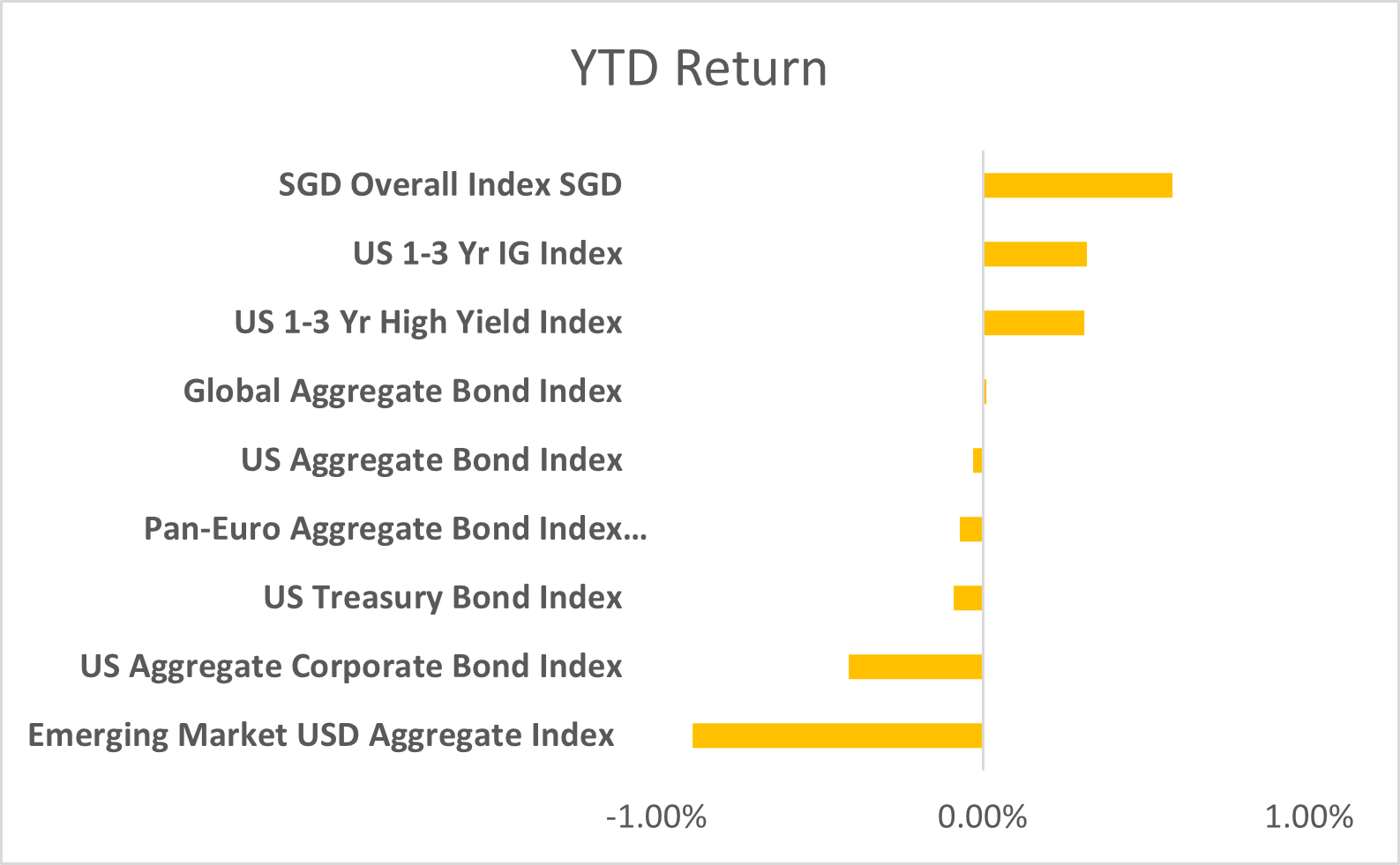 The war also reinforced the USD’s safe‑haven appeal, compounding the pressure on non‑USD markets. For Singapore bonds, this created a double‑whammy: higher global yields and a stronger dollar eroded returns, turning the SGD index from YTD leader into March’s laggard. Emerging markets were similarly squeezed, as compressed spreads offered little cushion against the rate shock and currency volatility.