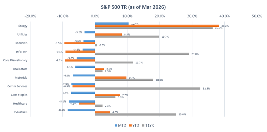Within the S&P 500, Energy (+10.4% MoM) was the only sector to post positive returns in March, driven by the sharp rise in oil prices amid escalating geopolitical tensions in the Middle East. Utilities (-3.2% MoM) and Financials (-3.6% MoM) also held up relatively better, reflecting a clear preference into defensive and income-generating segments as volatility picked up higher. The resilience in defensives was driven less by structural growth themes and more by capital preservation and earnings visibility amid rising macro uncertainty.