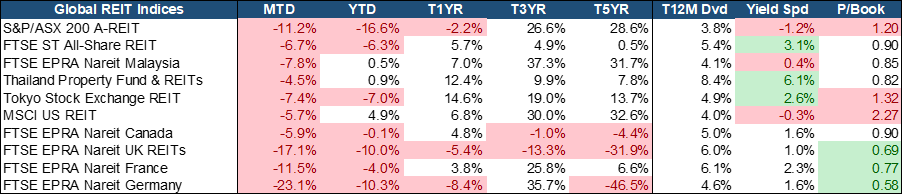 Global REITs reported negative performance across all markets in March 2026 as the Middle East conflict triggered heavy institutional selling and renewed interest rate pressure. Thailand (-4.5% MoM), the U.S. (-5.7% MoM), Canada (-5.9% MoM), and Singapore (-6.77% MoM) proved more resilient than their peers. Surging oil prices reignited inflation fears, causing the 10-year Singapore Government Bond yield to spike by 33 bps to 2.29%, which momentarily compressed the relative appeal of yield-sensitive assets.