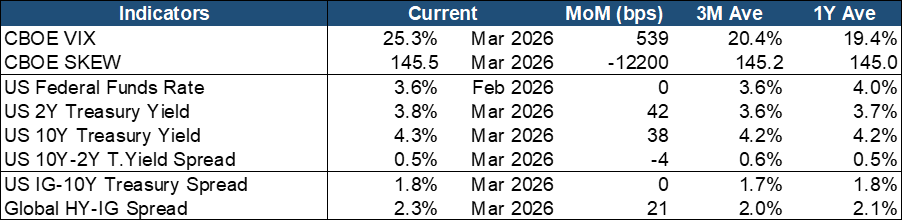 Treasury Yields spiked by 38-44 bps MoM while the Treasury Yield Spread has fallen slightly to 0.5%. This Bear-Flattening trend was primarily driven by the geopolitical energy shock and upside inflation surprises, which forced markets to aggressively price out 2026 rate cuts in favor of a ‘higher-for-longer’ stance. This shift signaled bearish sentiment for equities as rising discount rates and the risk of stagflation weighed on growth expectations. In the credit market, the IG-Treasury spread remained unchanged, but the 21-bps widening in the HY–IG spread indicates the same risk-off sentiment, rotating away from lower-tier credits that are more vulnerable to shifting monetary policy and slowing economic momentum.