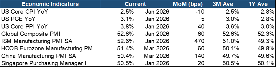 On the growth front, global manufacturing momentum is accelerating MoM, with key markets like the US (PMI: 52.6) and the Eurozone (PMI: 51.4) firmly in expansionary territory. Singapore also sustained its recovery, with its manufacturing PMI at 50.5, marking an eighth consecutive month of expansion despite a slight easing from February. This suggests that although growth is losing some steam, the broader industrial cycle has not rolled over decisively. Taken together, the combination of sticky inflation metrics and moderating but still-expanding manufacturing activity is likely to reinforce a cautious central bank stance.