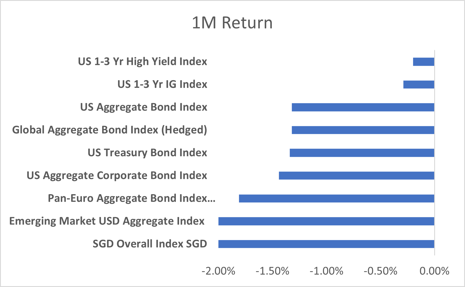 Bond markets endured a difficult March, with all major indices posting negative returns as yields rose sharply in response to the inflation shock stemming from the Iran war. The sell‑off was broad‑based, but the SGD Overall Index stood out as the worst performer in USD terms, down nearly 2% on the month. This marked a sharp reversal from its leadership earlier in the year, as the dual impact of higher global yields and a stronger USD created a double‑whammy for Singapore bonds. Even so, the SGD index remains one of the stronger performers on a YTD basis, underscoring the resilience of domestic credit fundamentals despite external headwinds.