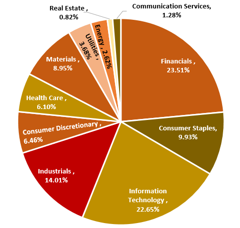 According to the index methodology, the ETF invests in leading enterprises with a diversified sector allocation.